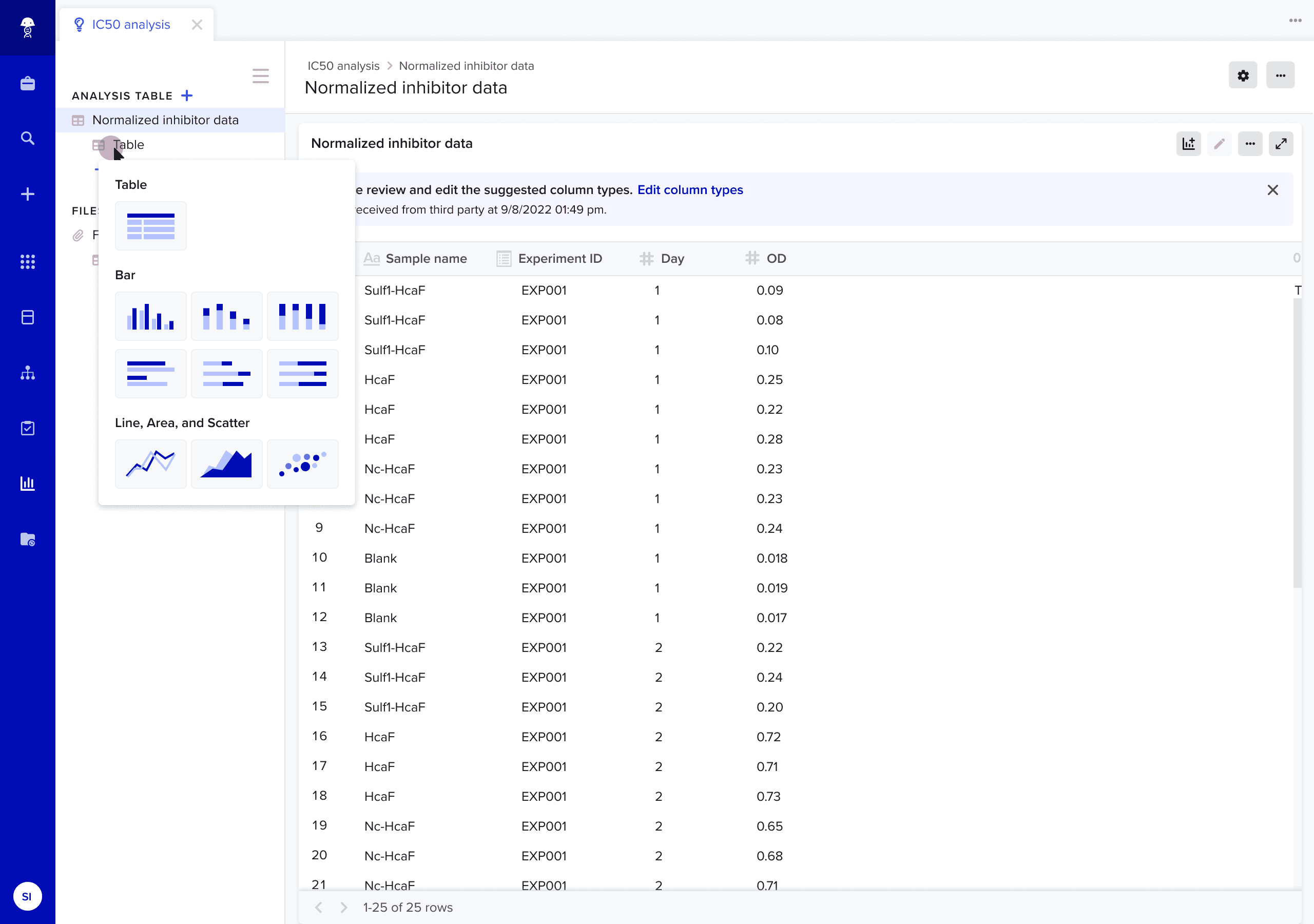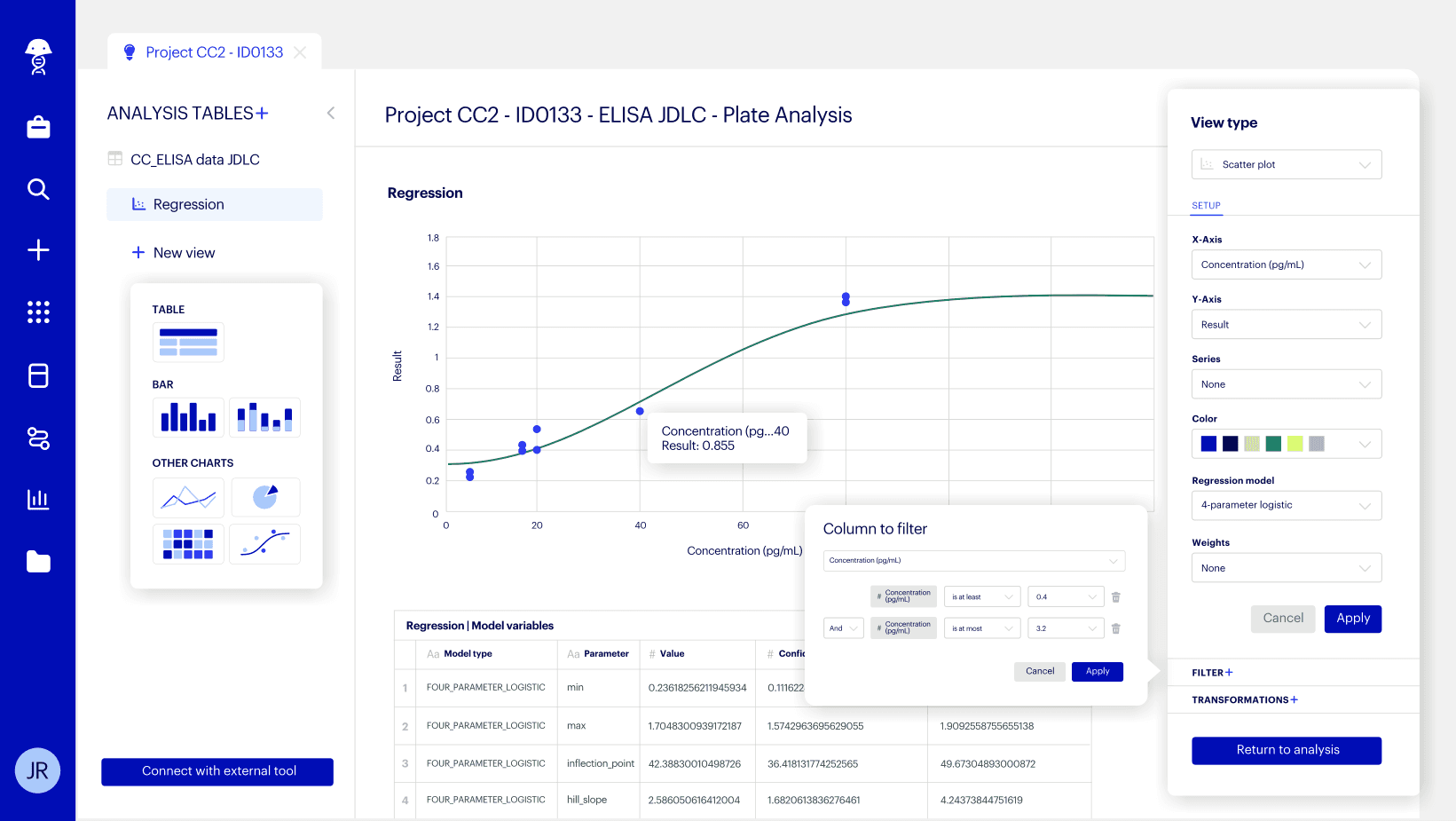 Apply filters and transforms to tables or charts with dynamic previews for instant feedback. This allows for precise data sectioning, for example to generate a standard curve using only rows of data marked as "Standards".