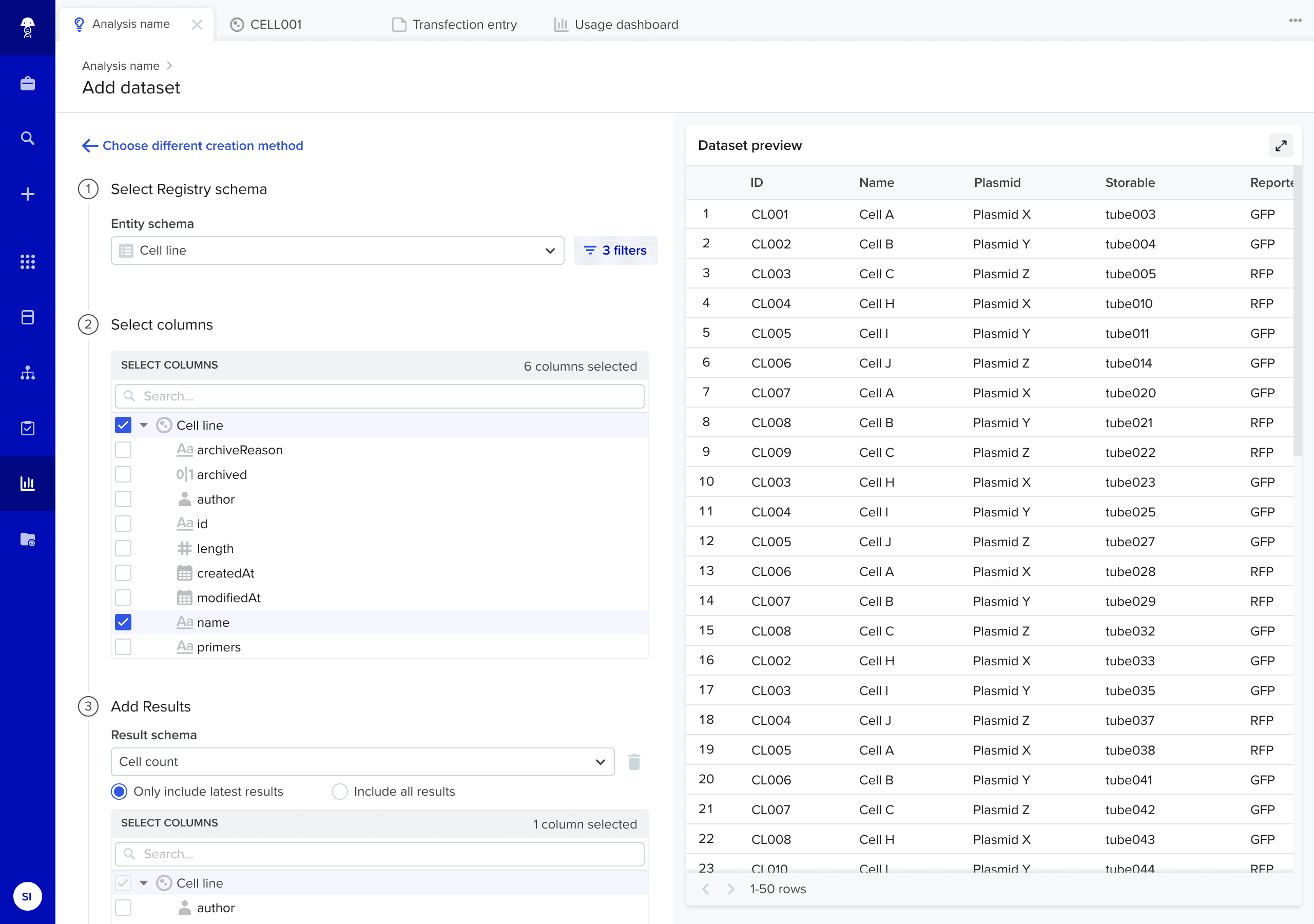 A point-and-click dataset creation tool allows users to traverse Benchling data structures to curate tables with all the metadata they want.