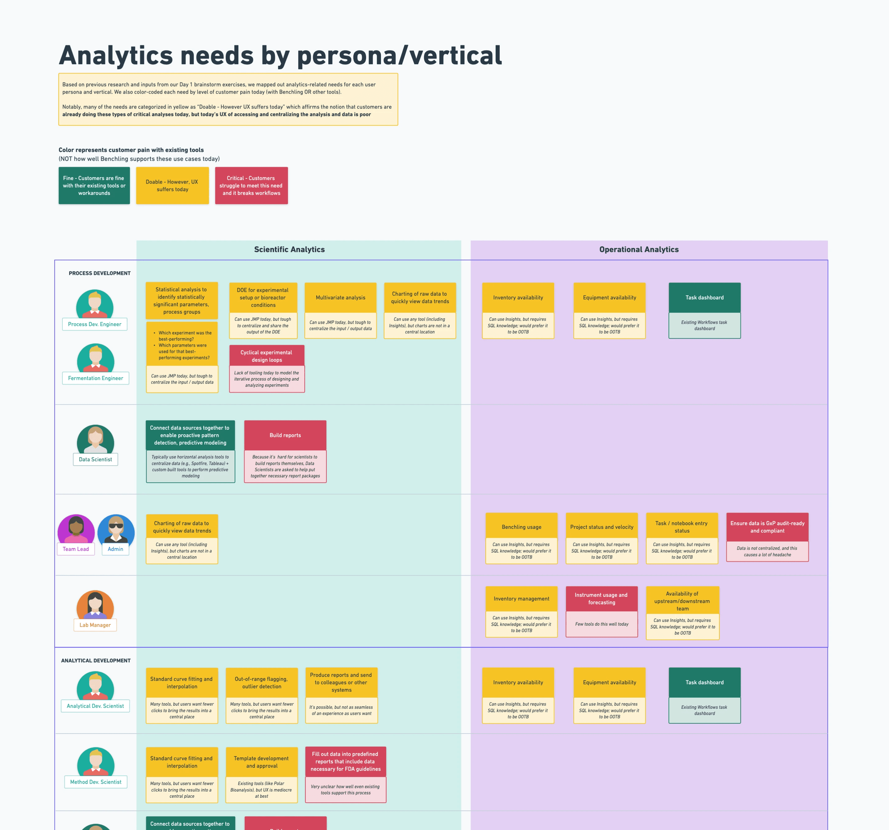 To find our focus, I led a week-long design sprint with partners from product, engineering, strategy, and customer success. We audited existing tools and mapped the landscape to answer the hard questions: Who are we building for? What data questions should we prioritize?