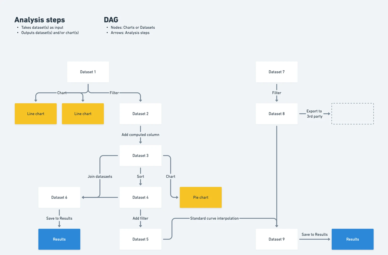 Based on our research insights, our engineering team chose to model analyses as a Directed Acyclic Graph (DAG), where the nodes are datasets and the arrows are analysis steps, or data transformations. While technically robust, my challenge was to translate this complex logic into something that felt effortless for a scientist to navigate.