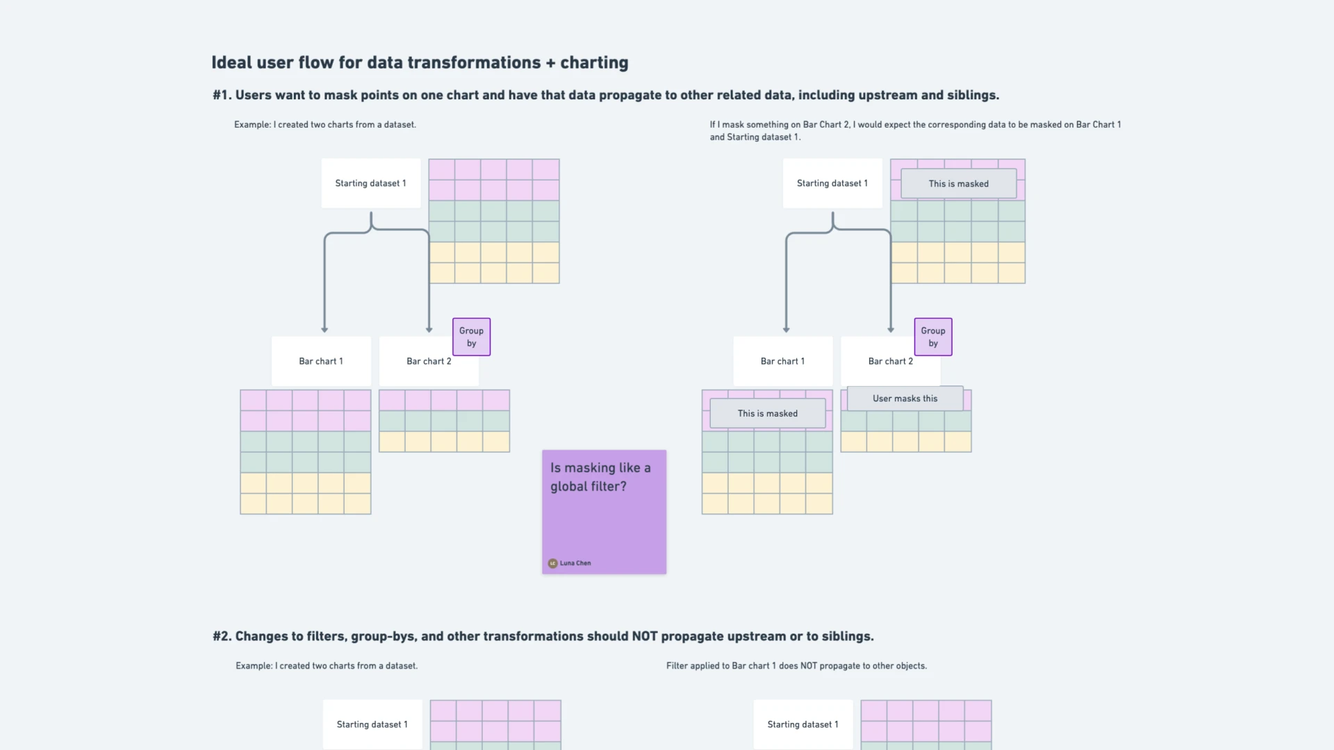 To bridge the gap, I created visual diagrams that explained data transformations and their ripple effects through the analysis. These diagrams became our team’s shared language, aligning our mental models across functions and ensuring that engineers, PMs, and designers were all building toward the same behavioral logic.